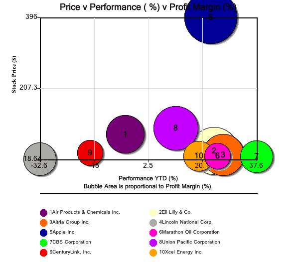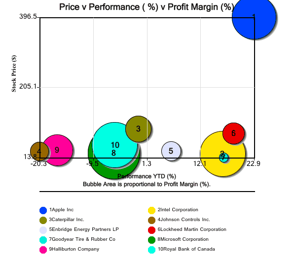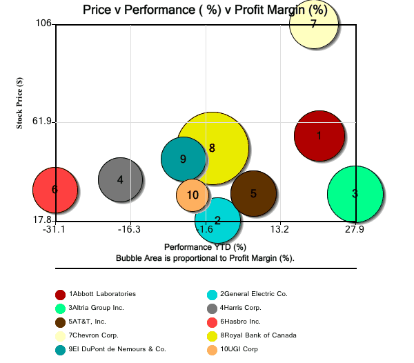 In today’s bubble chart, we look at several views of TheStreet.com’s Top 10 stock picks for 2012. Source: 10 ‘High-Quality’ Stocks for 2012 In the first bubble chart, the x-axis displays performance year-to-date (%); the y-axis displays current price; and the bubble area represents the latest reported profit margins. Interesting to note that half of […]