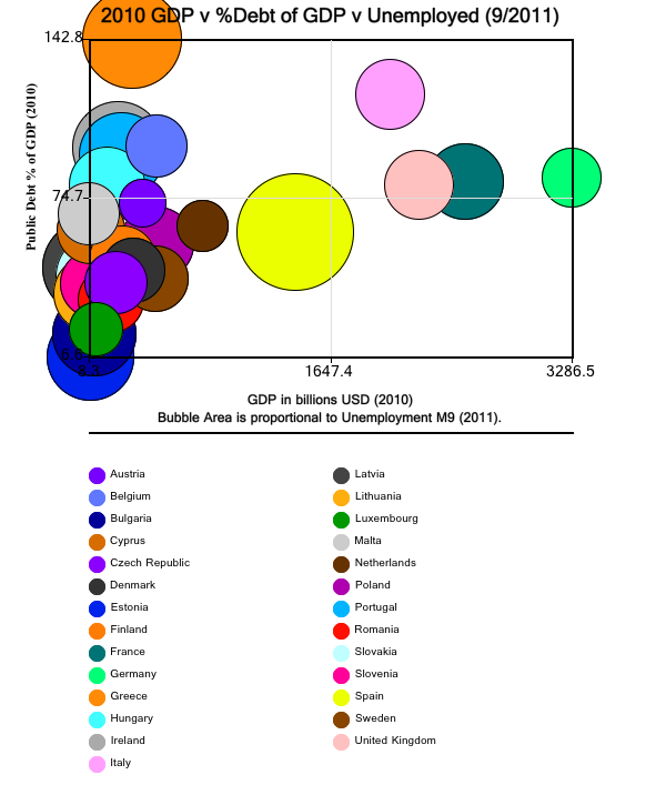 In today’s bubble chart, we show a comparison of 27 countries in the European zone. The x-axis is Public Debt as a Percent of GDP; the y-axis is the 2010 GDP; and the bubble area represents Percent Unemployment in September 2011. The highest percent unemployment is Spain at 22% The bubble chart below shows a […]