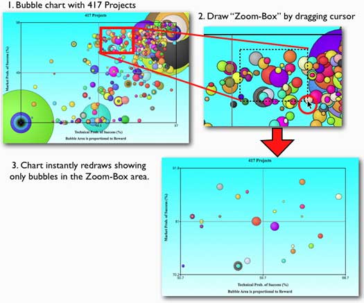 How do you analyze a crowded bubble chart? The bubble chart above has 417 bubbles with many overlapping bubbles and a wide range of bubble sizes. Bubble Chart Pro™ makes it easy to analyze the chart using “Zoom Boxes.” By clicking on a selected point of the chart and dragging the mouse to another point, […]