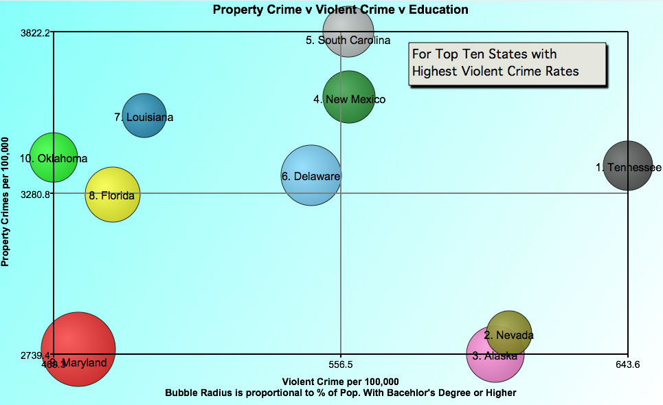 A similar bubble chart (below) where bubble radius is proportional to the percent of population with bachelor’s degrees suggests that states with a higher percentage of college graduates have fewer property crimes. However, a higher percentage of college graduates does not appear to correlate with the rate of violent crime positively or negatively.