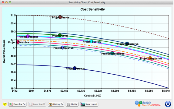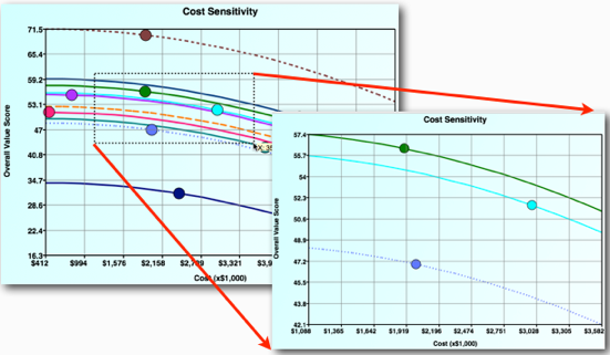 Let’s look at testing the sensitivity of a Cost attribute. The goal of attribute sensitivity test ing is to model what happens when one attribute changes while all the other attributes are held constant. The Sensitivity Chart for the Cost attribute above shows that as the costs go up, the overall value score of each project goes down. You can use this chart to see what happens when an individual project’s costs change because it may become more or less valuable than other projects.