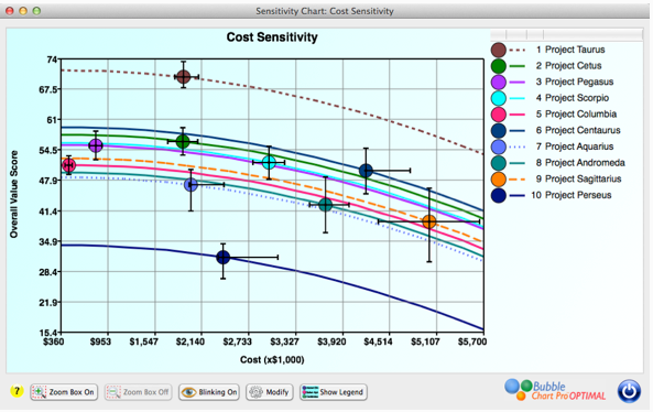 With the new risk bars that we’re introducing in Bubble Chart Pro Version 6, you will be able to see the uncertainty in each project and how it compares to other projects in your project portfolio as shown in the chart below. You can toggle the display of these bars on and off in the chart preference form.