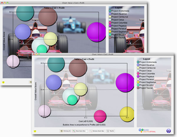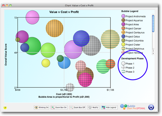 Bubble charts are extremely useful in comparing individual projects in multiple dimensions. Today, with the introduction of custom legends in version 5 of Bubble Chart Pro™, we have made it easy to track groups of projects by assigning pattern and/or color-pattern combinations to custom legend items. For example, if you wanted to track projects by […]