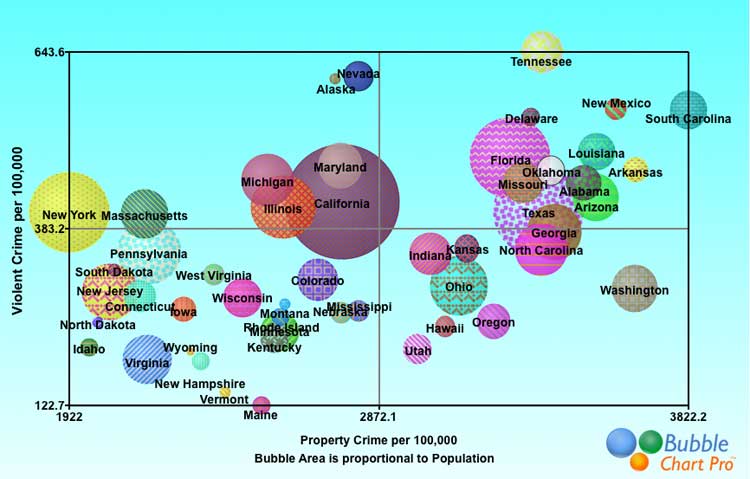 Annual FBI statistics on violent and property crime show the rate of each type of crime per 100,000 residents by state. This bubble chart shows violent crime per 100,000 residents on the y-axis and and property crime per 100,000 residents on the x-axis. Bubble size represents population. By combining the violent and property statistics for […]