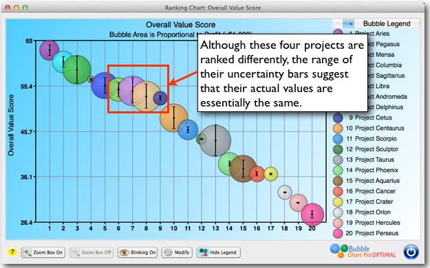 Figure 1: A Project Ranking Chart displaying Uncertainty Bars. You know that making project portfolio decisions requires making predictions about the future. Predictions about timing, markets, costs, ROI, etc. And these predictions usually involve a single value, percentage, or date. And most of the time, they’re wrong. But, Bubble Chart Pro™ OPTIMAL can help you […]