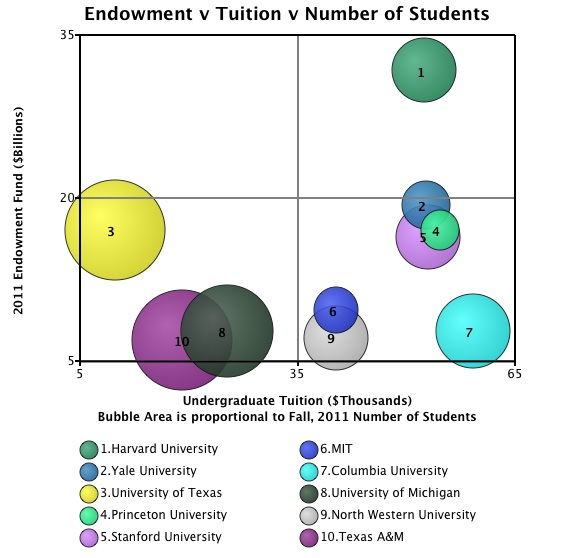 Today’s Bubble Chart is from data published in an article on Yahoo! Colleges are ranked in the legend by size of endowment. “As tuition costs continue to mount at universities across the nation, some colleges are sitting on mountains of cash. And while some of that cash goes to regular campus operations or scholarships for […]