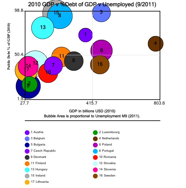 In today’s bubble chart, we show a comparison of 27 countries in the European zone. The x-axis is Public Debt as a Percent of GDP; the y-axis is the 2010 GDP; and the bubble area represents Percent Unemployment in September 2011.
